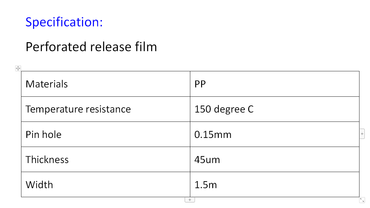 The density of the perforation plus the diameter of the hole help to control the flow of resin bled away from the laminate.Some films are release coated to enable an easy separation from the laminate with the breather bleeder. Perforated nylon release film are used against the tool surface to ensure easy release of the component from the tool and also for use as a separating layer between the component and breather fabric to prevent component adhesion to the fabric. Care should be taken with release coated films that are placed directly against a laminate.